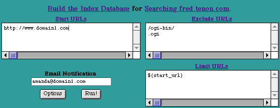The indexing CGI displays a form with a fields for entering the URLs to be indexed, excluded and limited and an optional email address.