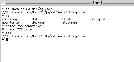 Now you have everything in place, you need to go to your WebTen server & set the permissions on the files. The counter.pl script, being a CGI, will need to be set to execute as a CGI, so in the shell window, navigate to the CGI-BIN & at the prompt, type: