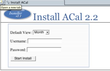 So, to install, we need to simply copy the 'Calendar' folder across into your webserving directory. What you will need to decide is where you are going to serve the calendar from, so for example, we want or iTools server to serve the calendar out of http://www.mysite.com This will probably equate to the directory on your iTools server as /Library/Tenon/WebServer/WebSites/mysite.com So, load up your favourite FTP client application & upload the Calndar directory within from the Acal-2.2.3 folder. Assuming you have the iTools PHP installed, we're just about set to go. Just make sure that index.php files are a default serving option on your server for the host which is serving your calendar or you'll need to manually load the PHP file in question. So, head on into your favourite web browser & enter the URL which will correspond to your new Web calendar, like so: http://www.mysite.com/calendar Assuming everything is working correctly, you should see this:
